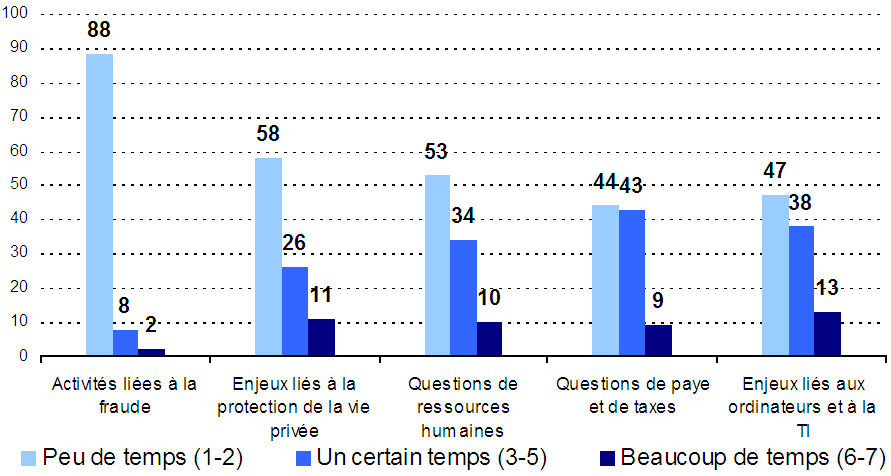 Tandis que de nombreuses entreprises consacrent régulièrement du temps à la réalisation d’activités liées à la protection de la vie privée, l’étude révèle que ces efforts prennent relativement moins de temps qu’un grand nombre d’enjeux courants, comme les enjeux liés aux ordinateurs et à la TI, les questions de paye et de taxes, ainsi que les enjeux dans le domaine des ressources humaines.