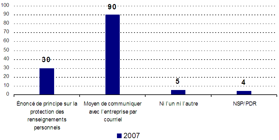- Dans le droit fil de la mise en application de la LPRPDE (et des lois provinciales de même nature en application dans certaines provinces), les entreprises au pays doivent remplir certaines obligations en ce qui concerne la collecte, l’utilisation et la communication des renseignements personnels de leurs clients. Dans le cadre du sondage, nous avons interrogé les répondants au sujet de questions diverses : la mise en place de politiques de protection de la vie privée claires pour superviser de quelle façon l’entreprise et ses employés recueillent, utilisent et communiquent des renseignements personnels; la mise en place de mesures de protection des renseignements personnels contre un accès interdit; la mise en place de façons, pour les clients, de pouvoir demander et obtenir les renseignements personnels que détient l’entreprise à leur sujet; la mise en place de procédures qui permettent aux clients de déposer des plaintes s’ils estiment que leurs renseignements personnels ont fait l’objet d’un traitement inapproprié, et la question de savoir si l’entreprise a un énoncé de confidentialité sur son site Web.