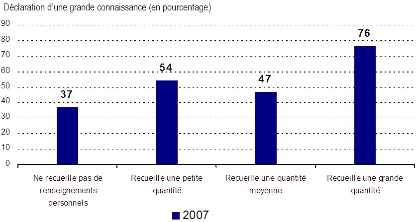 - Les résultats signalent néanmoins qu’il faut absolument faire connaître les obligations des entreprises en vertu des lois canadiennes sur la protection des renseignements personnels, étant donné qu’en proportions semblables, les répondants font état d’une connaissance faible ou modérée des obligations des entreprises dans ce domaine. On constate par ailleurs une amélioration remarquable chez les entreprises qui recueillent des renseignements personnels, les entreprises qui recueillent le plus de renseignements personnels auprès de leurs clients déclarant un bien meilleur niveau de connaissances.