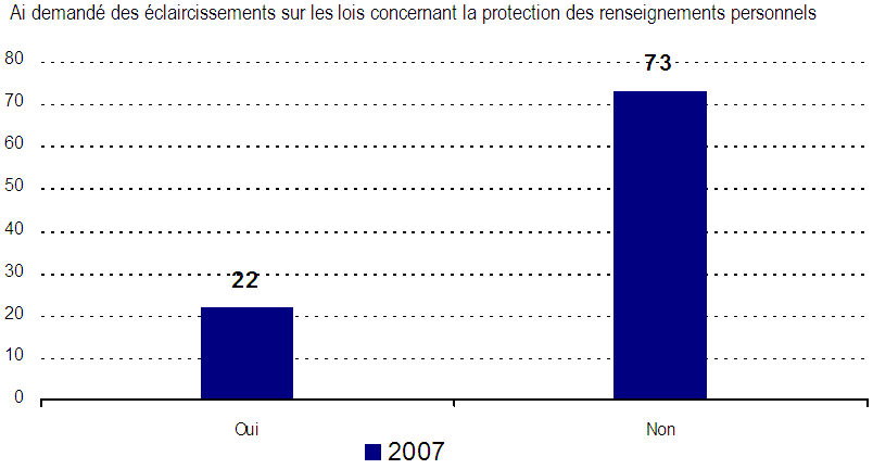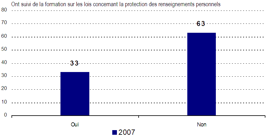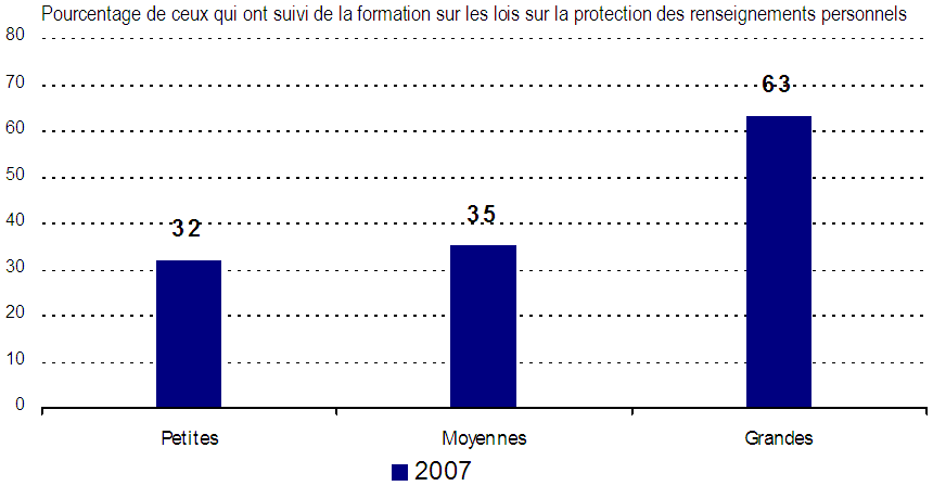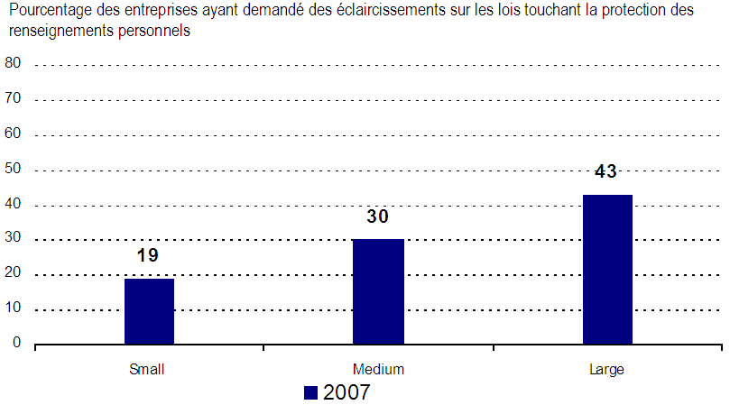 - Le tiers des entreprises seulement indiquent que des membres de leur personnel ont reçu de la formation au sujet des pratiques et obligations dans le contexte des lois canadiennes sur la protection des renseignements personnels, encore que ce soit beaucoup plus marqué chez les grandes entreprises. Par ailleurs, c’est dans une proportion inférieure à un pour cinq que les entreprises ont cherché à obtenir des éclaircissements sur leurs responsabilités, même si ce résultat est de nouveau beaucoup plus élevé chez les grandes entreprises.