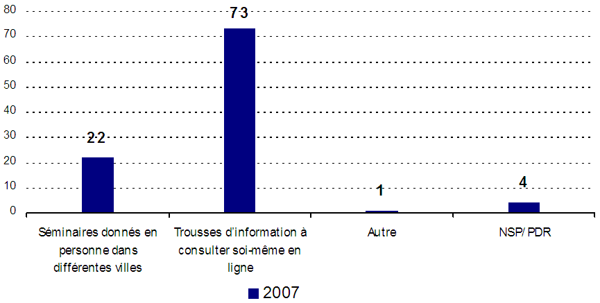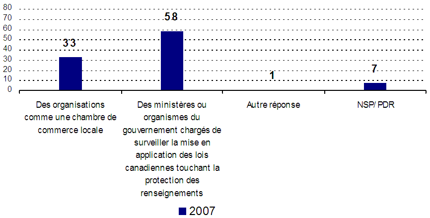 - De même, en proportion importante, les entreprises sont d’avis qu’il pourrait être assez utile d’offrir de la formation dans ce domaine et que le gouvernement pourrait offrir davantage de ressources de formation. Pour la plupart, les entreprises sont beaucoup plus susceptibles de trouver utiles des outils d’auto-assistance comme des trousses d’information en ligne, encore qu’environ une sur cinq mentionne des ateliers dispensés en personne. En règle générale, les entreprises sont aussi beaucoup plus susceptibles de chercher à obtenir de plus amples renseignements auprès des ministères ou organismes compétents qui encadrent les lois canadiennes sur la protection des renseignements personnels, quoique environ une sur trois mentionne encore un organisme comme la chambre de commerce locale.