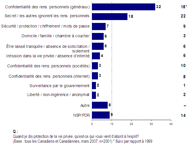 La protection de la vie privée continue de revêtir différentes significations pour des personnes différentes. Quand des Canadiennes et Canadiens se font demander ce qui leur vient d’abord à l’esprit en matière de « protection de la vie privée », ils mentionnent une multitude de choses différentes. En dépit de cela, ils ont de plus en plus en tête à cet égard la confidentialité de leurs renseignements personnels. Tandis que 18 % des gens avaient cet élément en tête en 1999, cette proportion est maintenant de près de 1 sur 3.