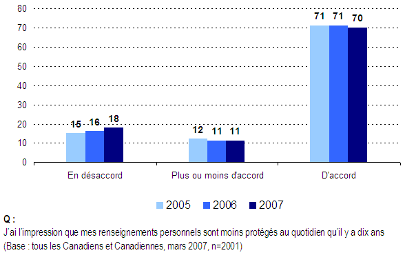 - En plus de signifier différentes choses pour différentes personnes, un autre aspect important de la situation actuelle de la protection de la vie privée réside dans le fait qu’une écrasante majorité de Canadiennes et de Canadiens disent que leurs renseignements personnels sont moins protégés qu’il y a dix ans. Ce point de vue est partagé par sept personnes sur dix, et cette proportion est essentiellement demeurée la même au cours des dernières années.