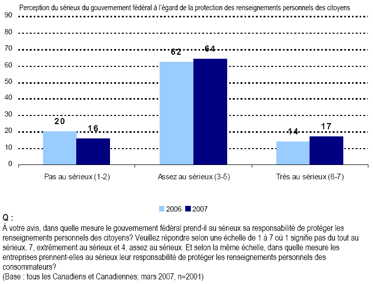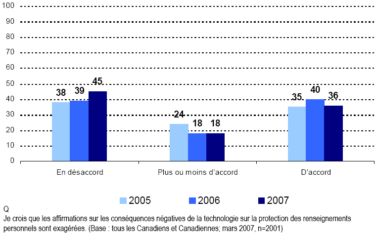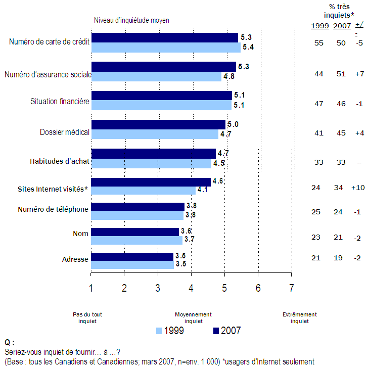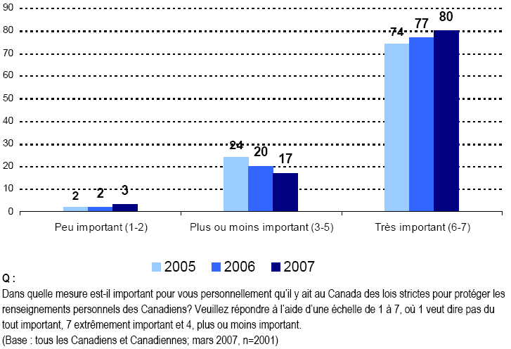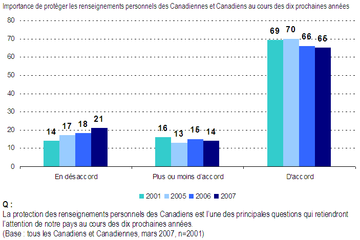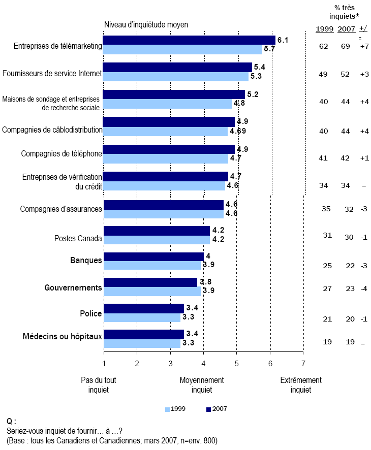 - Il est difficile de formuler des hypothèses sur l’acceptabilité de certains usages des renseignements personnels, mais il est tout aussi évident qu’un certain nombre de grandes tendances demeurent véridiques en 2007. D’abord, les Canadiennes et les Canadiens demeurent très préoccupés de la protection de leurs renseignements personnels. C’est tout particulièrement vrai en ce qui a trait au vol d’identité, qui est devenu en une période relativement courte l’une de leurs principales inquiétudes.