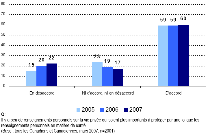 Comme par les années passées, les Canadiennes et les Canadiens sont toujours d’accord pour affirmer que les renseignements sur la santé représentent l’un des genres de renseignements personnels qu’il est le plus important de protéger en vertu des lois sur la protection des renseignements personnels.