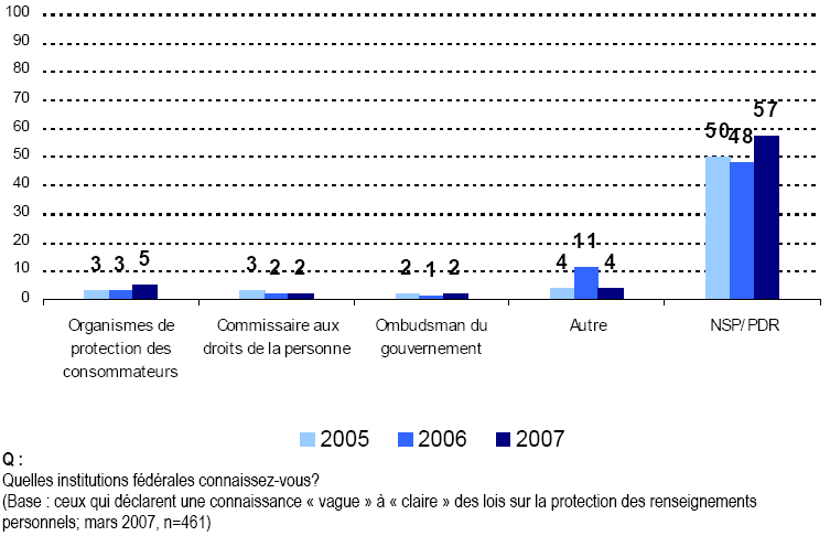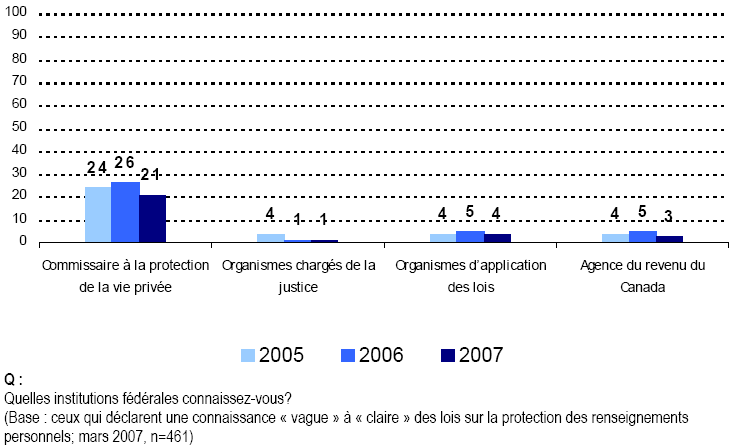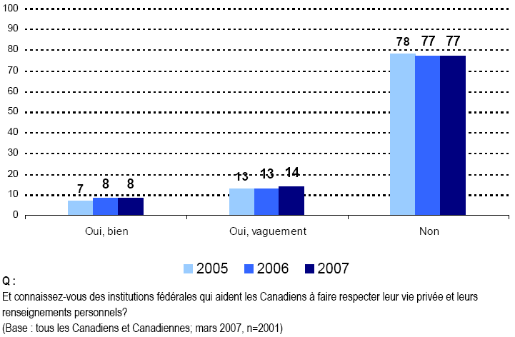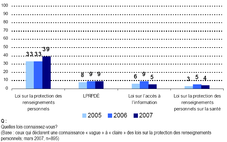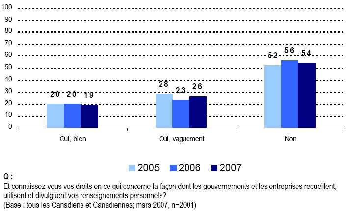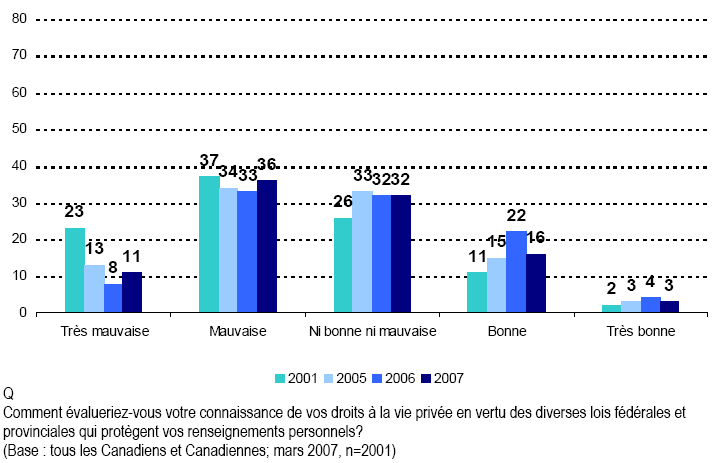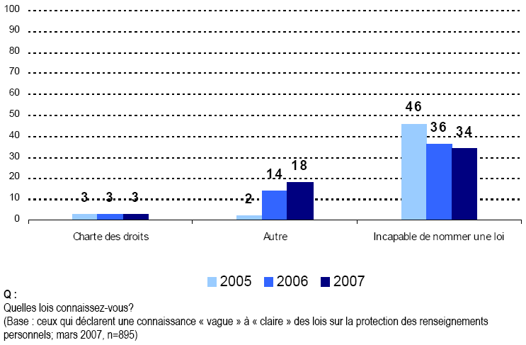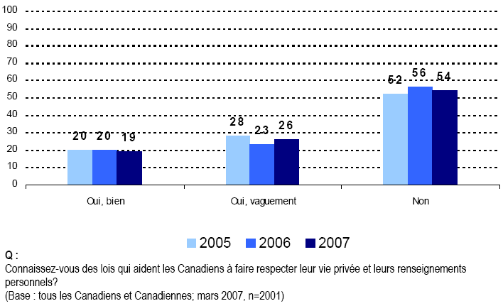 - Nous continuons d’observer que les Canadiennes et les Canadiens connaissent très peu les lois et les institutions qui protègent la vie privée de la population. En outre, ils font état de niveaux de connaissance également faibles pour ce qui concerne leur propre droit à la vie privée.
