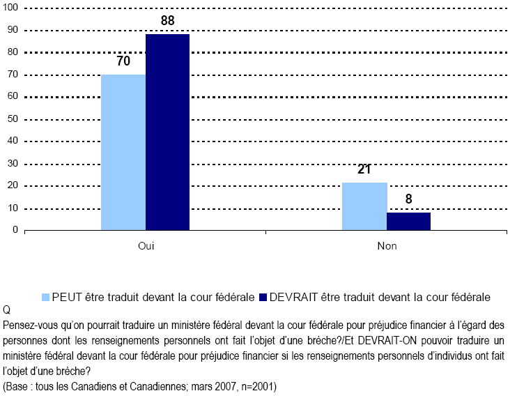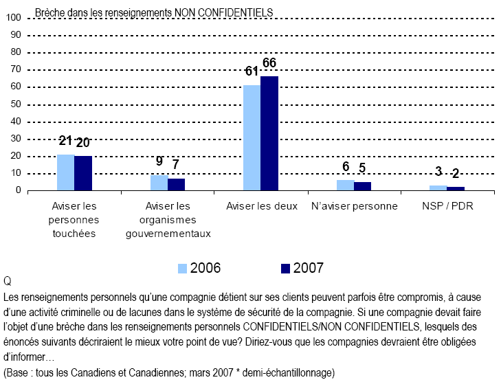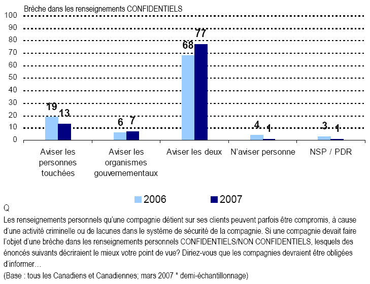 - Il y a eu un certain nombre de brèches importantes dans la protection des renseignements au Canada et aux États-Unis depuis environ un an. Des lois des États-Unis exigent la divulgation de ces brèches, mais il n’existe pas de telles lois au Canada à ce jour. En gros, les Canadiennes et les Canadiens rejettent essentiellement la notion selon laquelle des règles de divulgation ne sont pas nécessaires en matière de brèches dans la protection des renseignements. De fait, la plupart estiment que les organismes gouvernementaux et les personnes devraient être avisés, sans égard à la nature délicate de l’information (et cette perspective s’est renforcée au cours de la dernière année).