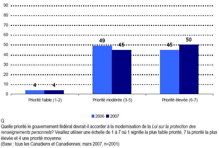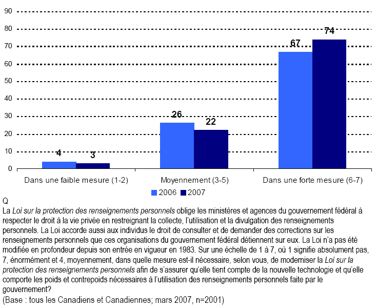 - Les Canadiennes et les Canadiens croient résolument que les lois doivent être actualisées en réponse à l’évolution rapide de la technologie de l’information. Comparativement à l’année dernière, la proportion des Canadiennes et Canadiens affirmant qu’une modernisation s’impose est en hausse de 7 points de pourcentage. De même, la modernisation de la Loi sur la protection des renseignements personnels en particulier est vue par de plus en plus de Canadiennes et Canadiens comme une priorité importante pour le gouvernement fédéral. Les personnes qui accordent les niveaux d’importance les plus élevés sont en hausse de 5 points par rapport à il y a un an.