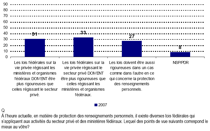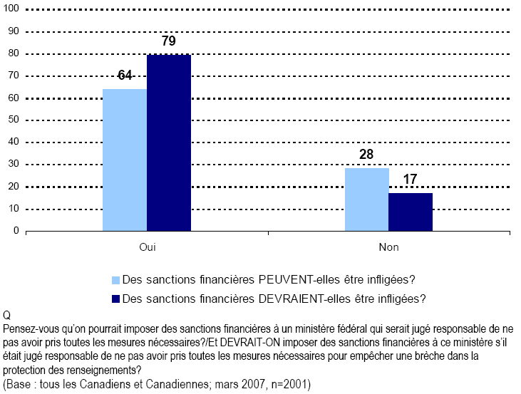 - Sanctions et lois — En proportion importante, les Canadiennes et les Canadiens sont d’avis que dans les cas où la confidentialité des renseignements n’est pas respectée comme il se doit, il existe des peines et sanctions applicables. Ces résultats indiquent que les dispositions qui seraient prévues à cet égard, selon les suppositions de la plupart des Canadiennes et Canadiens, ne sont pas dans les faits aussi rigoureuses qu’ils s’y attendent.