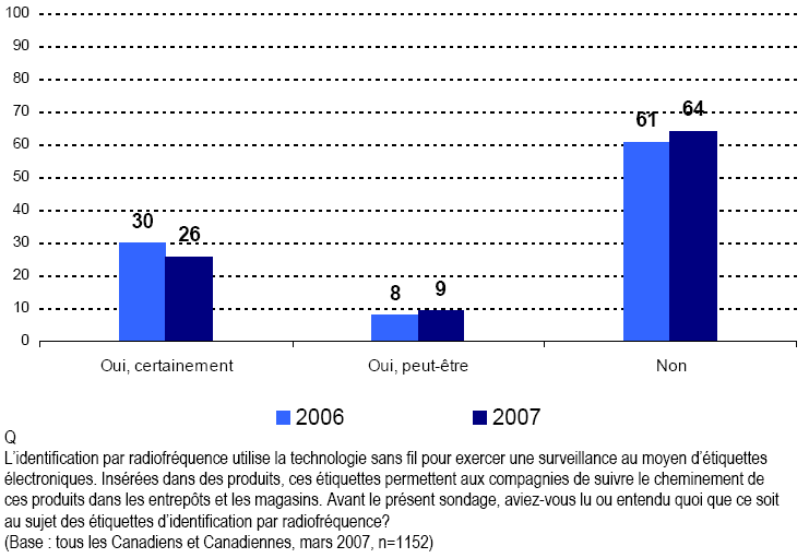 - Malgré de nombreuses discussions dans les milieux de la protection de la vie privée, en règle générale, les Canadiennes et les Canadiens ne connaissent toujours pas les dispositifs d’identification par radiofréquence qui sont installés dans des produits pour permettre à certaines sociétés de suivre le mouvement de leurs produits. De fait, les niveaux de connaissance sont légèrement en baisse par rapport à 2006.