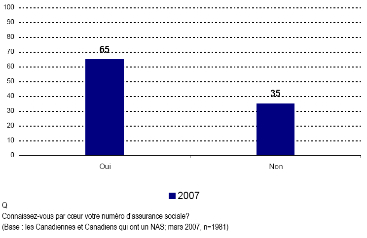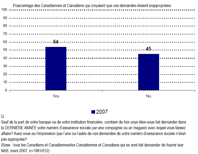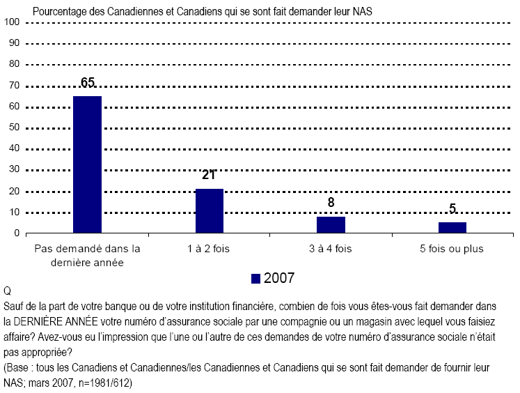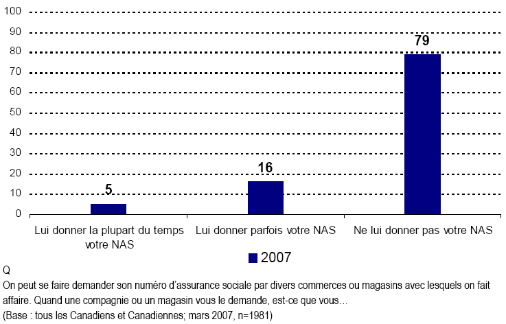 - Fait encourageant, la plupart des Canadiennes et des Canadiens ne fournissent pas leur NAS à des sociétés ou à des entreprises lorsqu’il leur est demandé, quoique certains le font encore. Ce qui est plus inquiétant, c’est qu’un nombre important de Canadiennes et Canadiens font encore l’objet de telles demandes de la part de sociétés ou de magasins et croient de façon répandue que ces demandes ne sont pas appropriées.