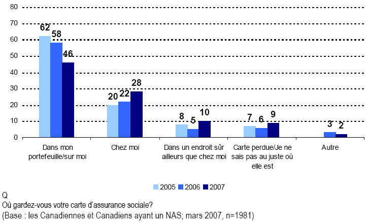 - Les Canadiennes et les Canadiens sont encore nombreux à garder leur carte d’assurance sociale dans leur portefeuille (quoique cette tendance soit en baisse). On pourrait faire valoir qu’il est très superflu d’avoir sa carte d’assurance sociale sur soi et qu’une telle pratique fait augmenter la possibilité que le NAS soit mal utilisé si le portefeuille est volé ou perdu.