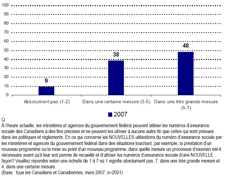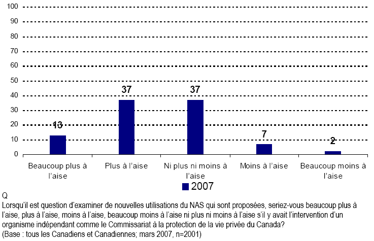 - Une majorité écrasante de Canadiennes et de Canadiens croient que tout changement à la façon dont les ministères et organismes gouvernementaux se servent des renseignements sur le NAS devrait passer par un processus d’examen, et un grand nombre se disent plus à l’aise si un organisme indépendant, comme le CPVP, prend part à ce processus.
